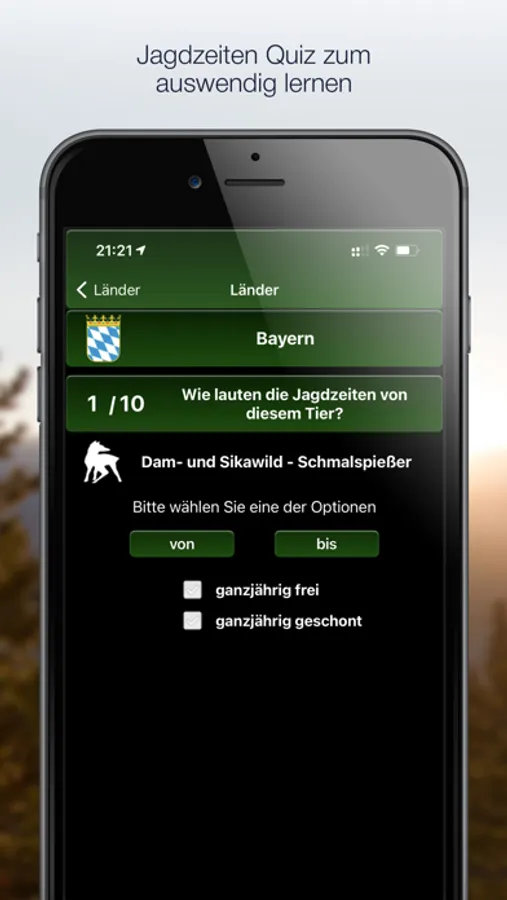 Mit dem Jagdzeiten-Quiz können Sie auf einfache Art und Weise Jagdzeiten auswendig lernen z.B. für die Jägerprüfung. Das Jagdzeiten Quiz ist in der Vollversion enthalten.