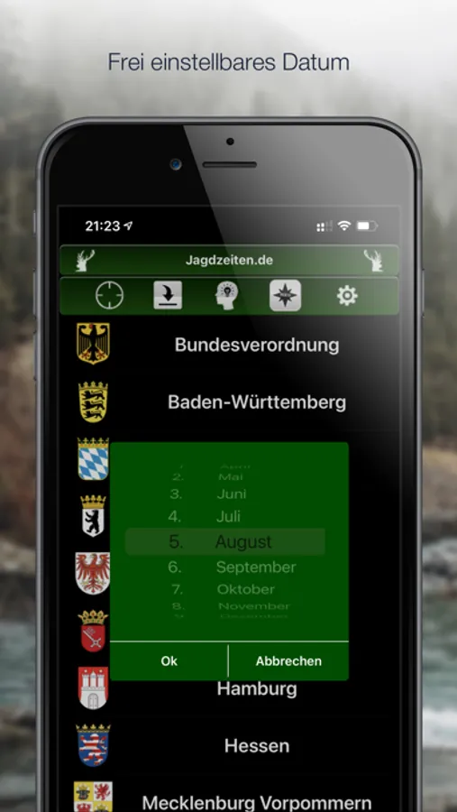 Frei einstellbares Datum - suchen Sie die Jagdzeiten nicht nur für heute sondern auch in der Zukunft oder Vergangenheit.