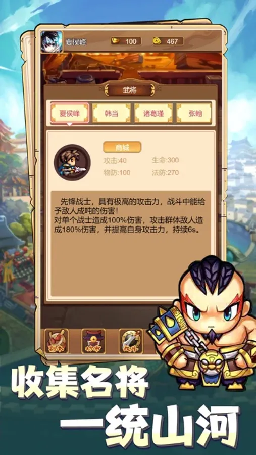 《三国小主公》是一款Q版三国画风的休闲挂机游戏。在游戏中,您可以选择自己喜欢的英雄参加战斗。选择武将,您将以一敌百,过五关斩六将,天下无敌手!选择文将,您将率领千军万马,傲世三国,一统江山!