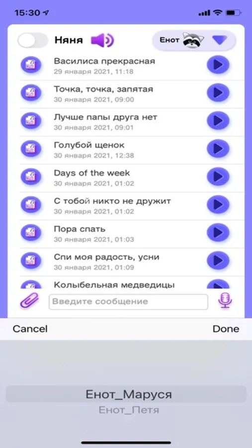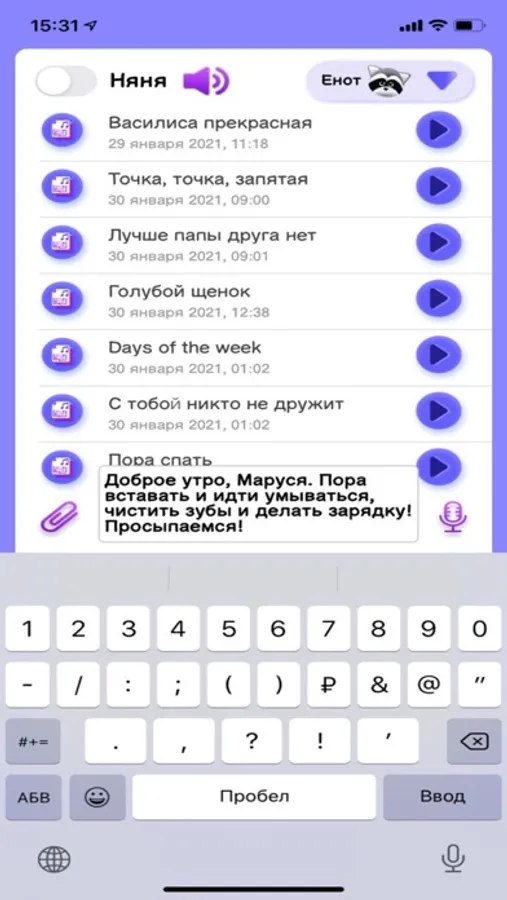 У Енотика есть встроенный микрофон, который вы можете включить или выключить в любой момент и с помощью которого Вы можете услышать, что происходит рядом с Енотом, можете пообщаться с теми, кто рядом с ним. Вы также можете записать свой голос, свою речь и отправить на воспроизведение Енотом. Енот воспроизведет ваш голос и с помощью микрофона запишет и передаст ответ.