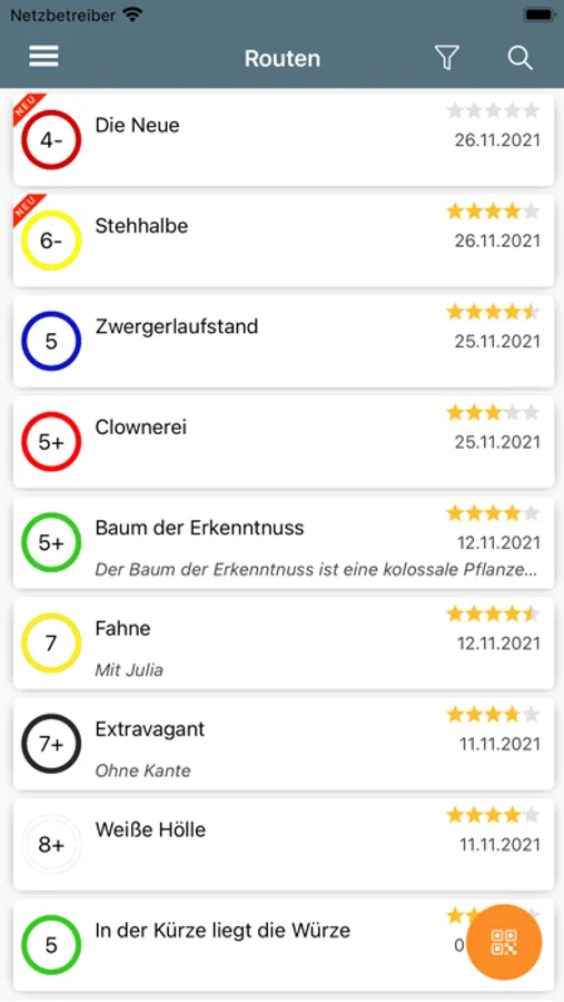 Ihr könnt Routen nach Schwierigkeitsgrad und Schönheit bewerten, eigene Kommentare abgeben und die Kommentare anderer Nutzer vor dem Einstieg lesen. Darüber hinaus könnt ihr eure persönliche Tickliste pflegen um eure Projekte im Auge zu behalten oder noch nicht gekletterte Routen in der Halle zu finden.
