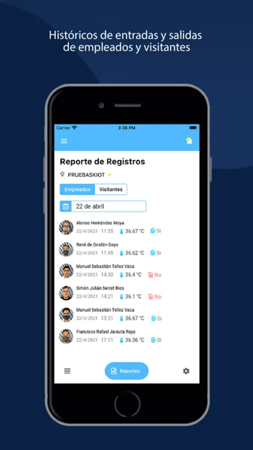 Reportes totalizados de entradas, salidas, temperaturas y cubrebocas.