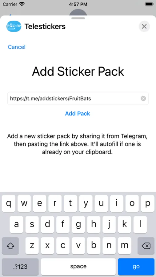 Paste in any Telegram sticker URL, animated or not, and use them as Messages stickers.