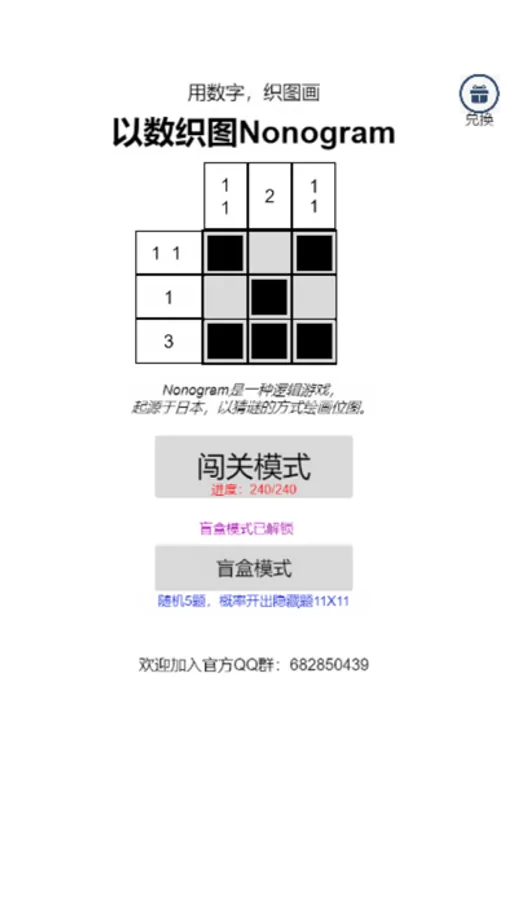 用数字,织图画。Nonogram是一种逻辑游戏,起源于日本,以猜谜的方式绘画位图。在一个网格中,每一行和列都有一组数,玩家需根据它们来填满或留空格子,最后就可以由此得出一幅图画。