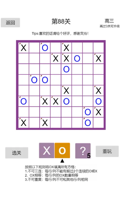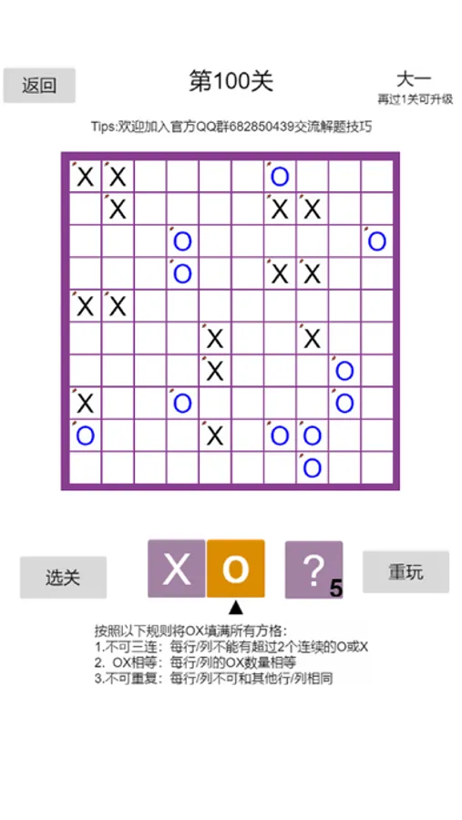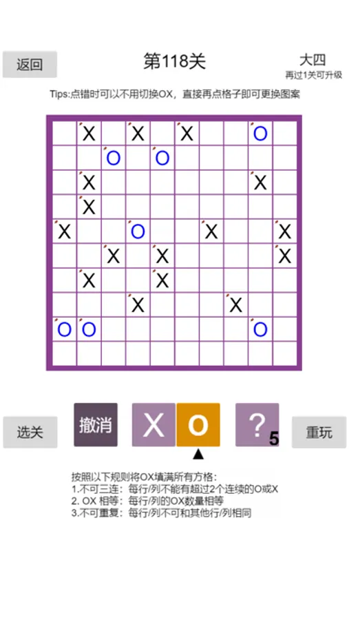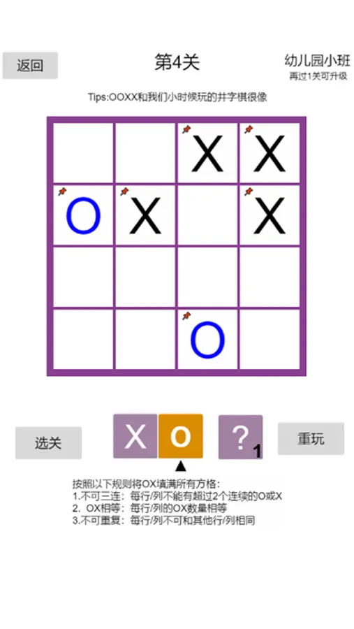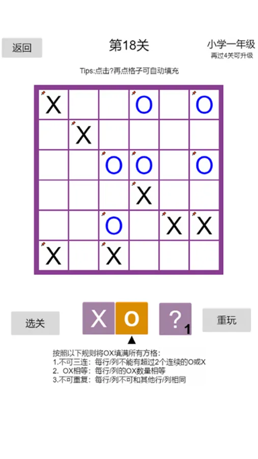 游戏规则简单易懂,将OX按要求填满所有方格即可: