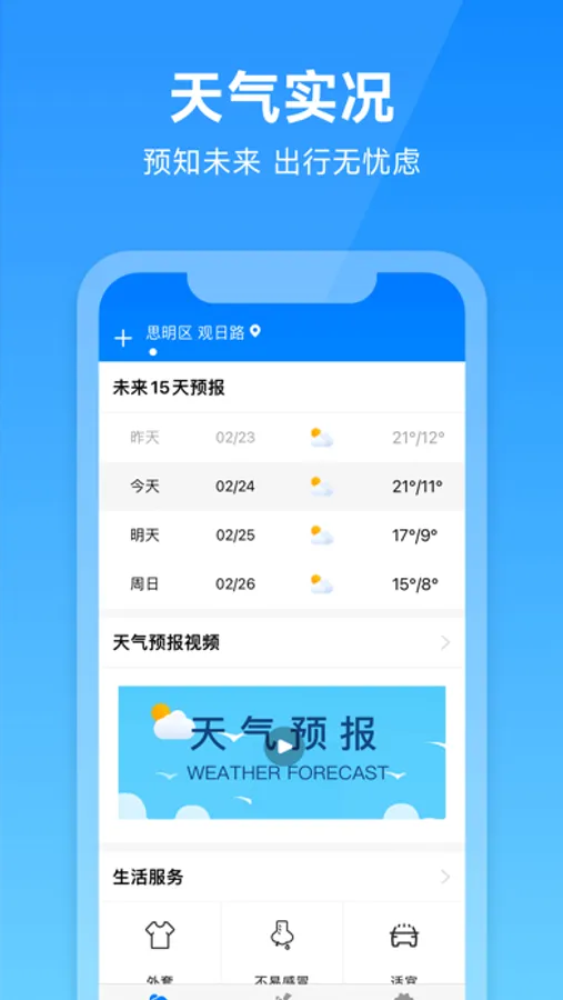 [温馨生活服务]无论是晴天天气还是雨天天气,天气预报帮助您出门不再纠结穿衣,是否要洗车、要带伞不再选择困难。通过感冒指数,紫外线指数,运动指数保障健康生活。