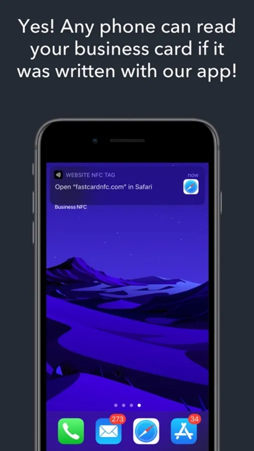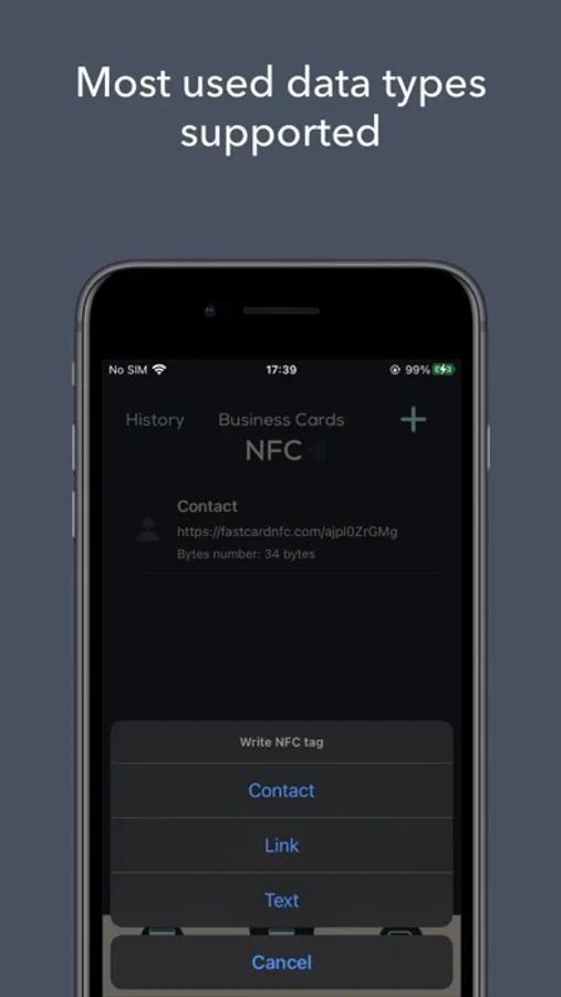 We are specialized in NFC Business Cards that can be read by all devices with NFC support. Up until this moment, iPhones can only read links without help from additional apps. Our app will generate and give you a short link that you can then write on your card. When used, the link will open the native phone app to save the contact.