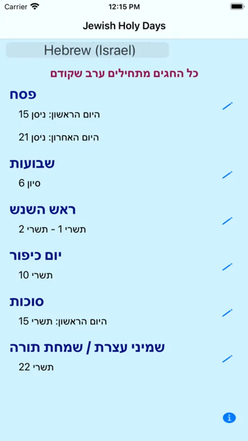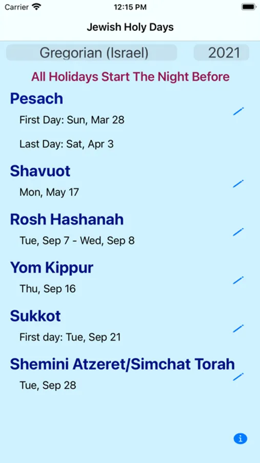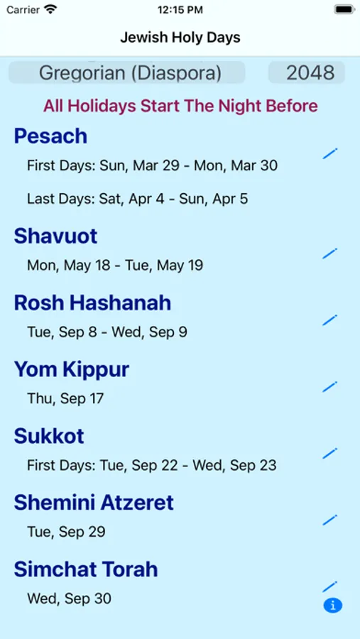 The App includes the Gregorian calendar dates of the holidays outside of Israel, the Gregorian calendar dates inside Israel, and the Hebrew calendar dates. It works for any Gregorian year from 2021 through 2050. The App will open on the current year and will default to the calendar that corresponds to your iPhone regional and language settings. Use the two pickers on the top of the screen to select a different calendar or year.