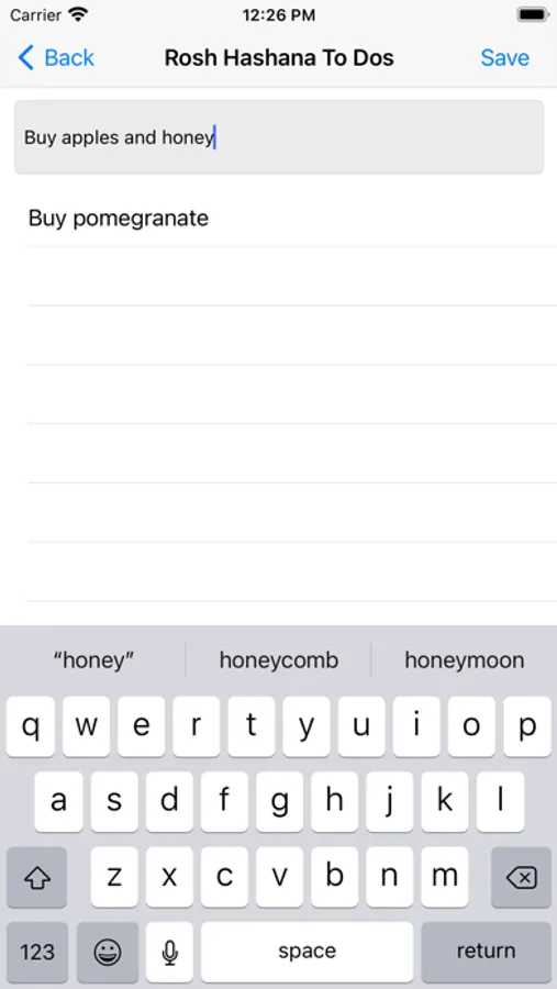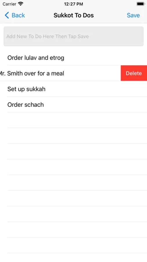 To create or access your to do list for a holiday click the pencil icon next to the holiday name. On the next screen add your to dos one at a time at the top and click Save. Swipe right on a to do to delete it. Leave the to dos that you’d like to use for next year.