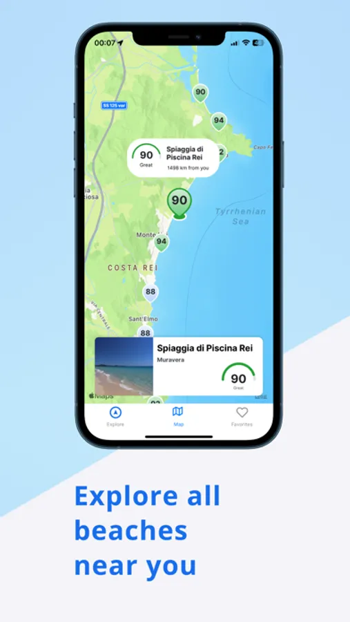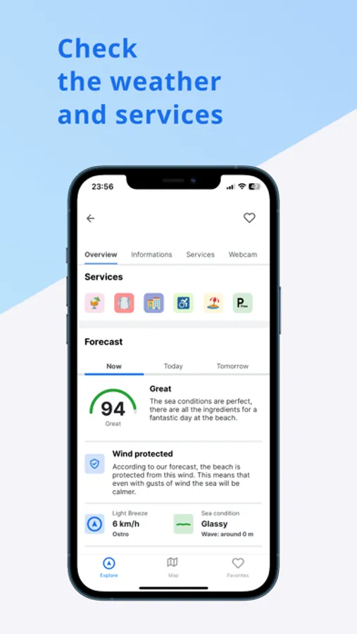 - Real-time rankings of the best beaches, based on the assessment of the intensity and direction of the wind, sea and weather conditions, temperature and your location.