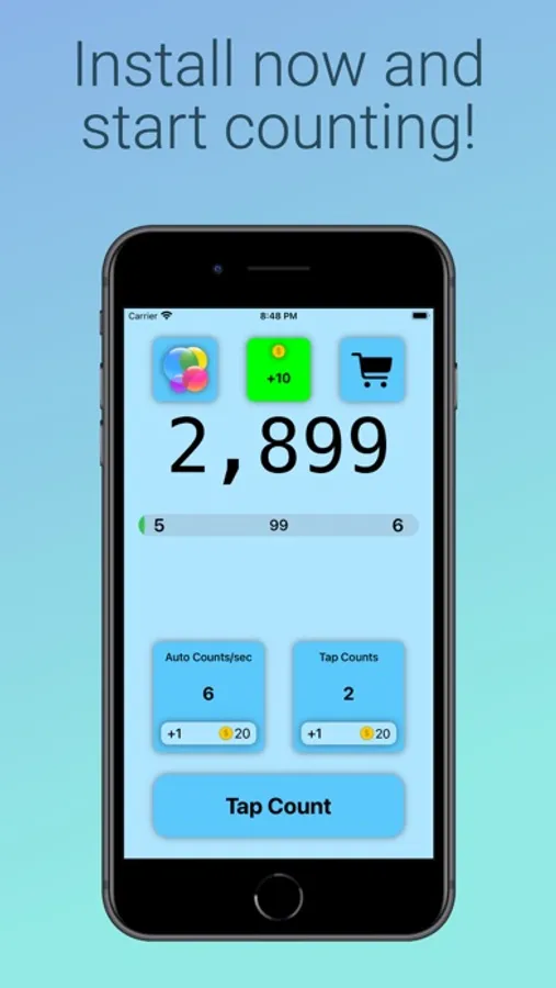 Earn coins by levelling up and use them to increase your auto counts or tap counts.