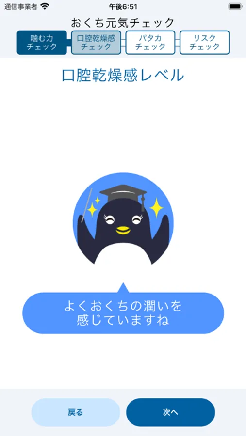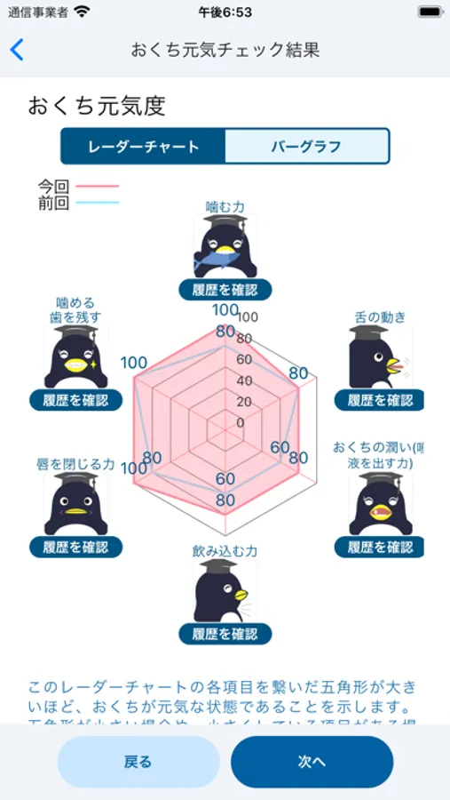 アンケートと発音チェックの結果は点数化およびレーダーチャート化され、お口の元気度を確認することができます。