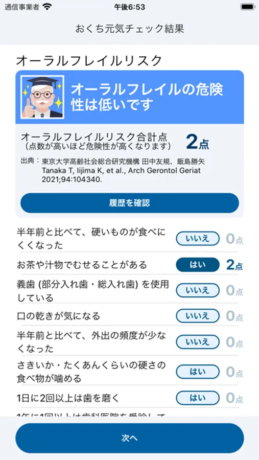 チェック結果の移り変わりを確認できるので、定期的にチェックすることでお口の元気度の推移をチェックできます。