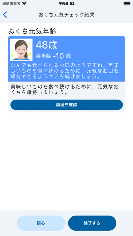 利用者登録すると「おくち元気年齢」が表示され、実年齢と比較できます。
