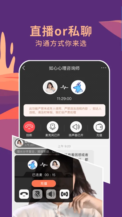 情感咨询是个细分领域,暂时没有情感咨询师这样一个认证标准,所以我们要求平台的咨询师持有婚姻情感咨询师证书、心理咨询师证书、婚姻家庭咨询师证书、家庭教育指导师证书等国家相关部门颁发的证书以及相应的从业经验或者其他可考证的用户认可的工作经验,是我们为了确保用户来到我们平台的时候,为其提供服务的人,应该尽可能的专业。除了能够满足用户的倾诉需求外,也能从自己的专业领域出发,为用户提供进一步的安抚、疏导、咨询服务。我们相信通过正确的培训和相关的国家认证的婚姻情感咨询师、婚姻家庭咨询师、心理咨询师、家庭教育指导师,是更掌握科学的技巧、更有能力为用户提供更大价值的人士,是用户正确的倾诉和咨询对象。