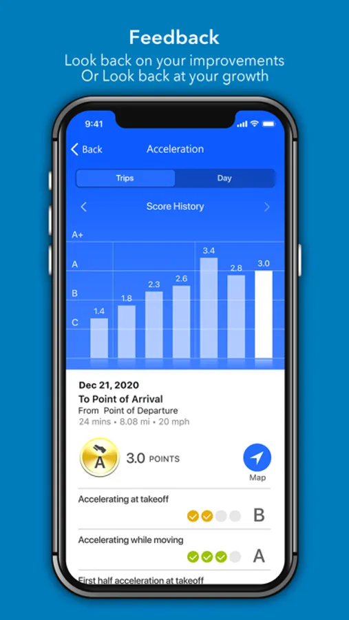 Once they are finished, they can use the app to look at a map with detailed record of where they went, a summary about their drive, and specific driving tips.