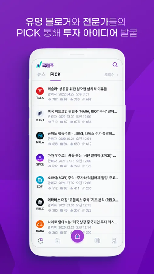 - 픽해주를 통해 국내외 유명 블로그와 전문가들의 PICK을 개별 종목/테마 별로 쉽고 빠르게 찾을 수 있습니다.