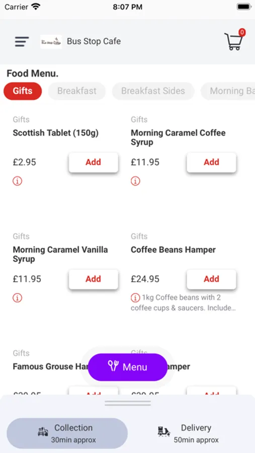 cafe serving Bfast, paninis , burgers, pasta along with softdrinks, tea coffee and alcohol for sit in and home delivery.