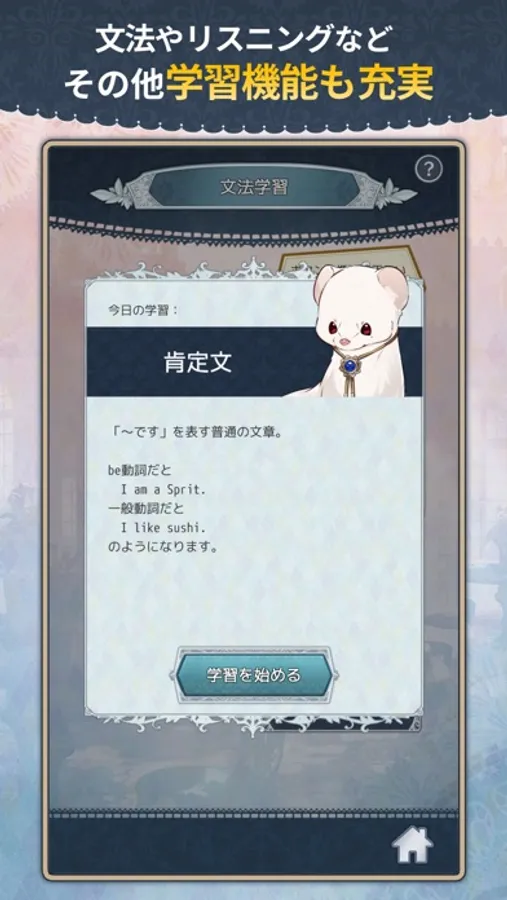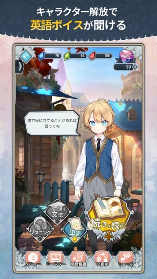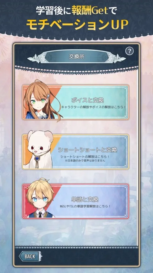 学習が終わると宝石の先の気になる本編に、毎日の学習で手に入る報酬で、ショートショートやHOME画面に配置するキャラクター・ボイスが解放可能!