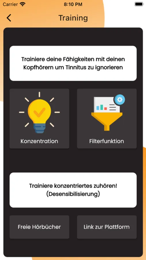 Die App beinhaltet Tests zur Ermittlung kognitiver Verarbeitungsleistung (zentraler Hörtest), standardisierte Fragebögen mit anonymer, statistischer Erfassung und Trainingsmodule zum trainieren der Filterfunktionsstörungen und zur Linderung der Wahrnehmung chronischer Tinnitus-Varianten. Ebenfalls enthalten ist eine Soundbar mit Naturgeräuschen zur Entspannung vom Tinnitus.