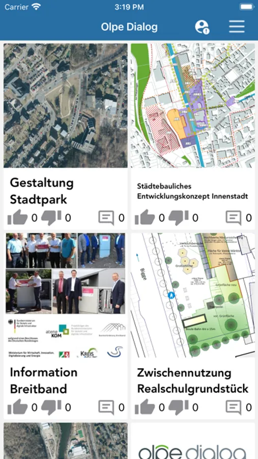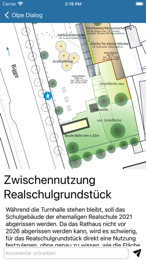 Einfach die App herunterladen und einen Account erstellen. Die Artikel können auch ohne Nutzerkonto gelesen werden. Allerdings steht die Kommentarfunktion nur für Account-Inhaber*innen zur Verfügung. Auf der Startansicht befinden sich mehrere Artikel mit Informationen zu aktuellen Vorhaben inklusive weiterführender Dokumente. Sowohl Kommentare als auch Bewertungen sind möglich und werden vom Projekt-Team gesammelt bzw. ausgewertet. Die Stadt Olpe wird fortlaufend über eingehende Vorschläge und Ideen informiert und kann ihrerseits Rückmeldung dazu geben.