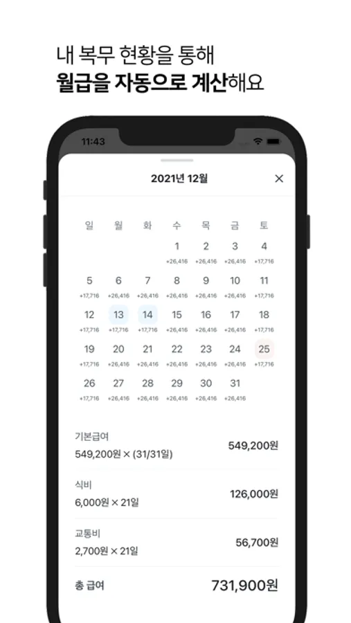 휴가를 등록하면 자동으로 월급을 계산하고 기본급, 식비, 교통비 따로 계산결과 까지 보여줍니다.