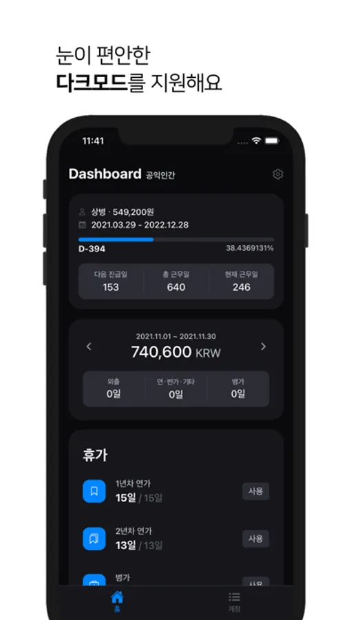 · 사회복무요원의 모든 휴가 종류 (연가, 오전/후 반가, 외출, 병가, 오전지참, 오후조퇴, 병가외출, 특별휴가, 청원휴가, 공가) 등록 가능하며 최소 10분 단위까지 남은 휴가를 계산해줍니다.