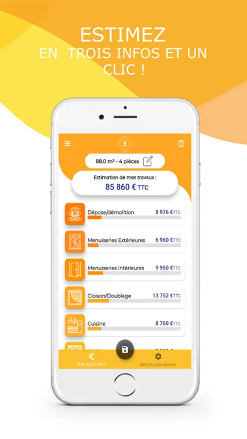 Après avoir téléchargé l’application, commencez par vous identifier afin de pouvoir enregistrer vos estimations dans votre bibliothèque. Pour estimer, la marche à suivre est très simple : renseignez la superficie, le département et l’année de votre bien. Cliquez sur “ESTIMER MES TRAVAUX” et cela vous délivrera une estimation globale de votre bien ainsi qu’une estimation plus détaillée par type de métier. L’estimation globale prend en compte toutes les prestations de travaux possibles réalisées par des artisans allant du revêtement de sol à la plomberie. Elle vous évite de rentrer manuellement les prestations de travaux et permet d'estimer une approche financière des travaux de rénovation.