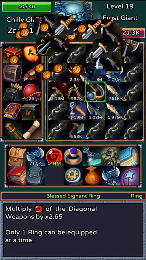 You cleave your way through the Monster Hordes, a Hungering Axe in your left hand and a Grim Blade in your right...and about a dozen assorted Swords, Maces, Hammers, Crossbows, and Staves in your backpack. You know. Just in case you need them! An Ash Demon falls before you, then a Cyclops and a Stone Golem. Finally you face a hulking Mighty Revenant - the battle is great, but the spoils are greater: a Divine Gleaming Slicer is now yours. As you swap it out with your Grim Blade, you get a message in your head, almost as if from another world...it says: