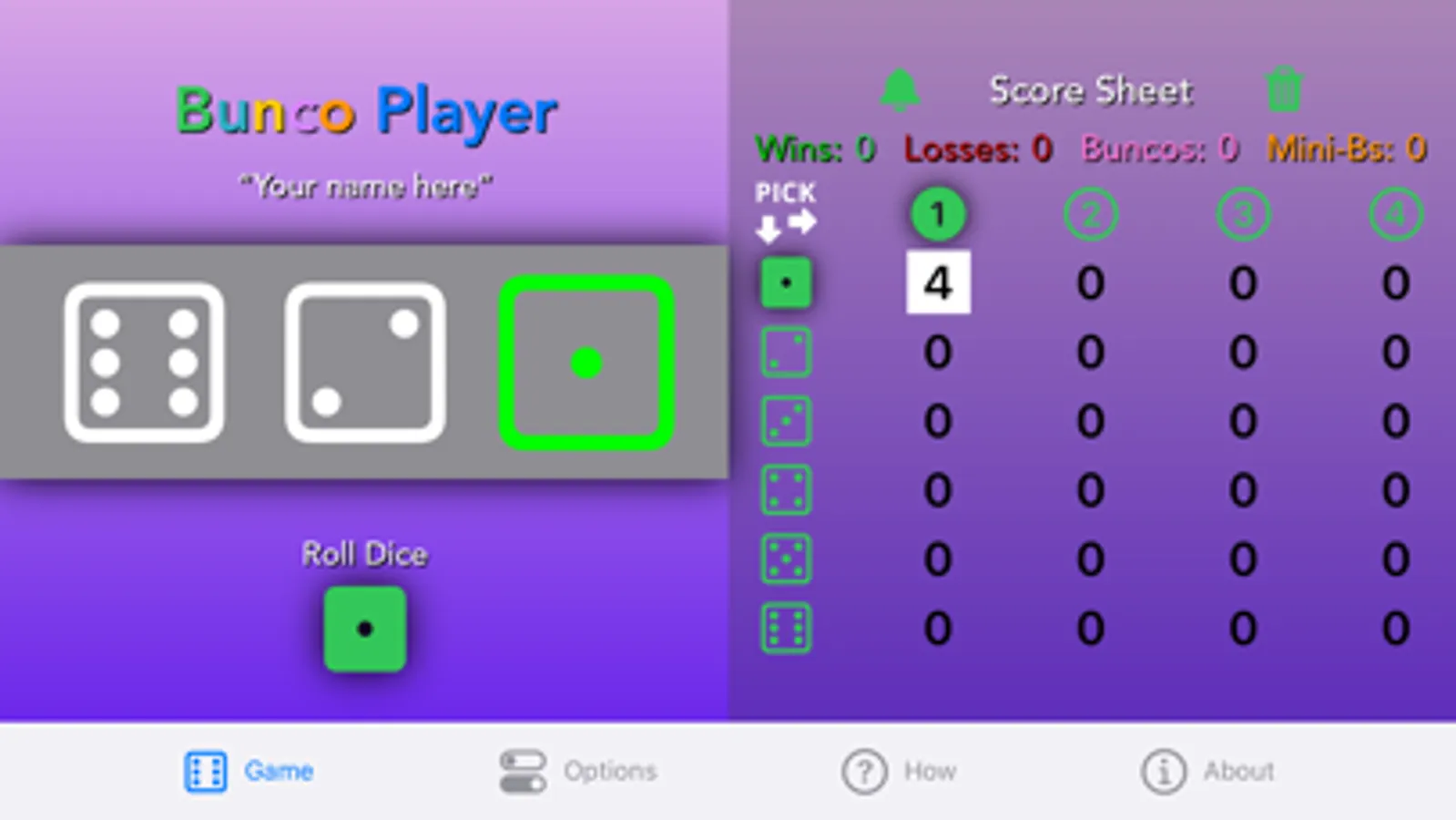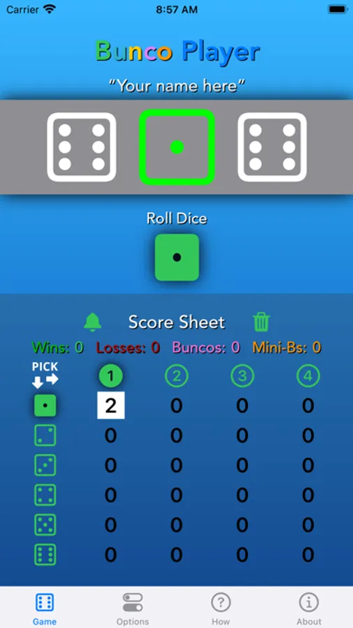 In the Game Tab, be sure to select the desired Target Dice and Game Number using the Green Buttons. This will highlight the Active Score in WHITE. The Active Score will automatically update.