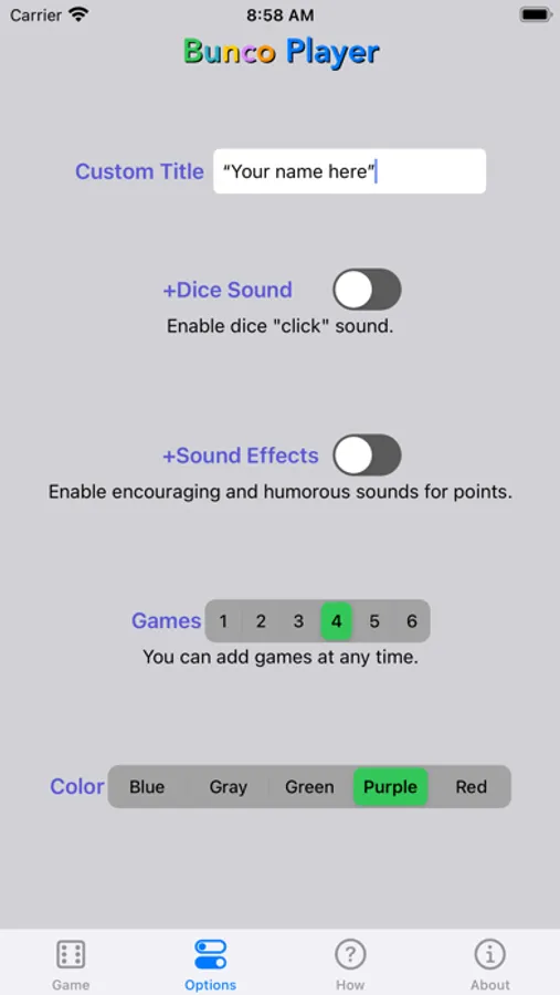This app supports 1-6 Games with each game consisting of all 6 Target Dice.