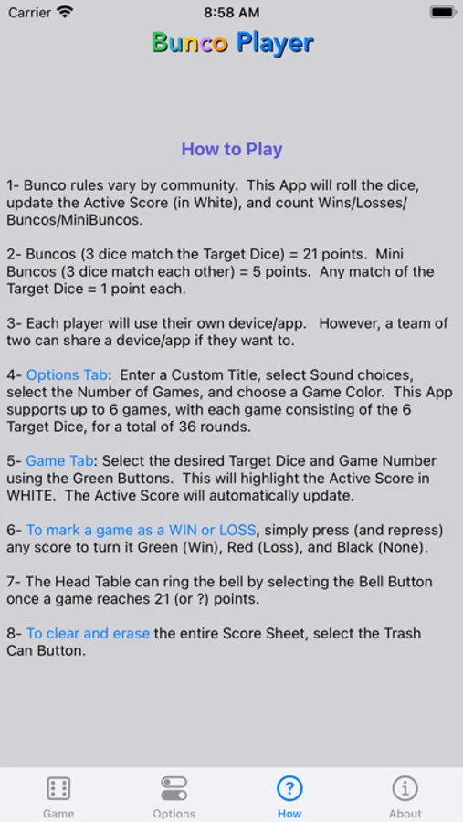 Bunco rules vary by community; however, this App will roll the dice, update the score, count the Wins/Losses/Buncos/MiniBuncos, and allow the Head Table to "ring" the bell!