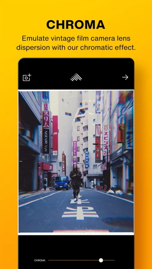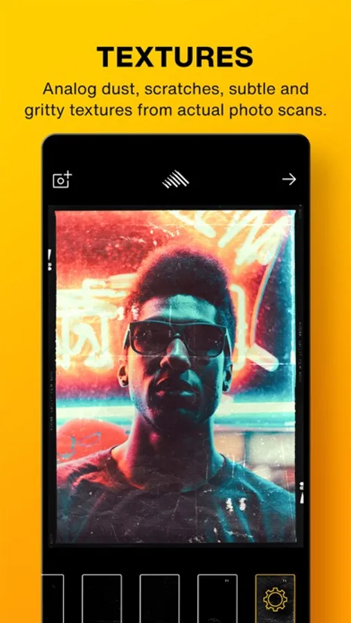 Our favorite tool. After you import your photo, tap our logo on top and Filme will automatically apply random effects to get you started. Then browse the tabs and perfect your photo settings.