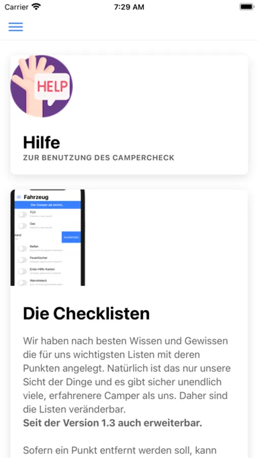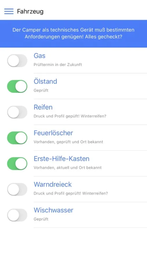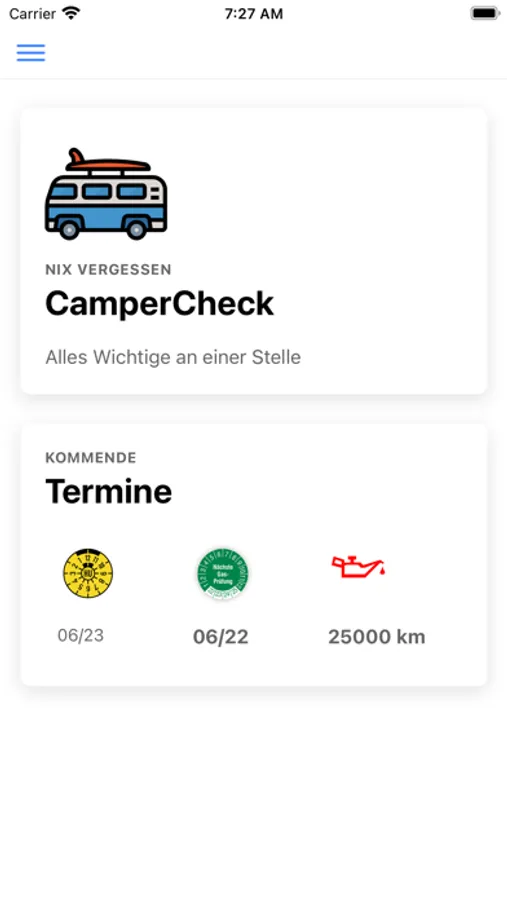 Es passiert sehr schnell, das Kabel ist noch am Camper, ein Fenster bei der Abfahrt noch geöffnet ... der Schaden kann immens sein. Hier hilft der kompakte CamperCheck. Je nach Situation bietet diese App Checklisten an. Diese können natürlich an die persönlichen Bedürfnisse angepasst werden. Darüber hinaus erinnert die App an die wichtigsten Termine für das jeweilige Fahrzeug.