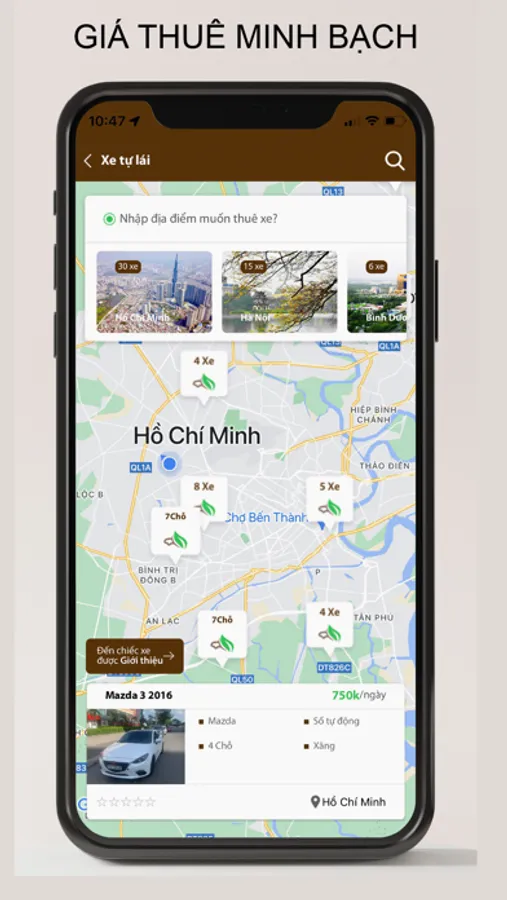* Thuê Xe Có Tài - Với những thao tác đơn giản bạn có thể biết trước được giá của chuyến đi và chọn xe theo ý thích. Thuê và hủy chuyến đơn giản.