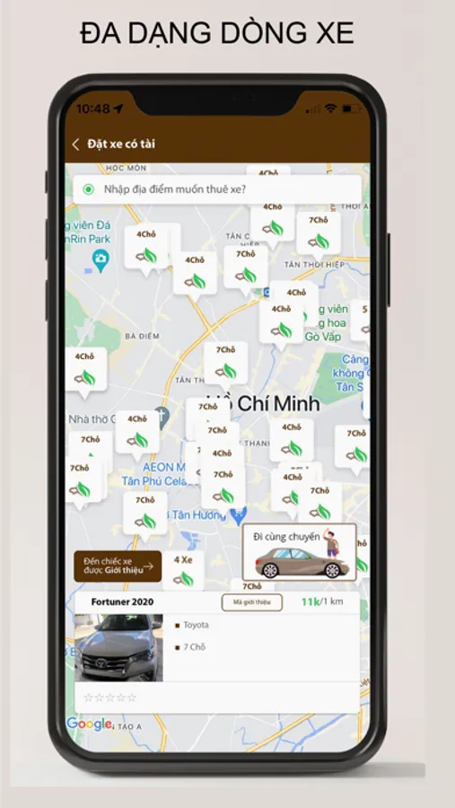 * Thuê Xe Đi Cùng Chuyến - Khách hàng có thể lựa chọn và tìm kiếm các chuyến xe phù hợp với lộ trình của mình. Có 2 cách trả phí là mua vé hoặc tính theo Kilomets quảng đường đi của bạn, có nhiều người cùng đi thì giá sẽ giảm dần. Ngoài ra, khách thuê có thể tự tạo chuyến mới và mời những người khách cùng đi.