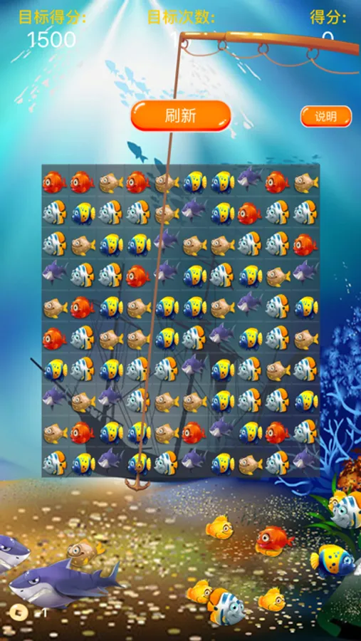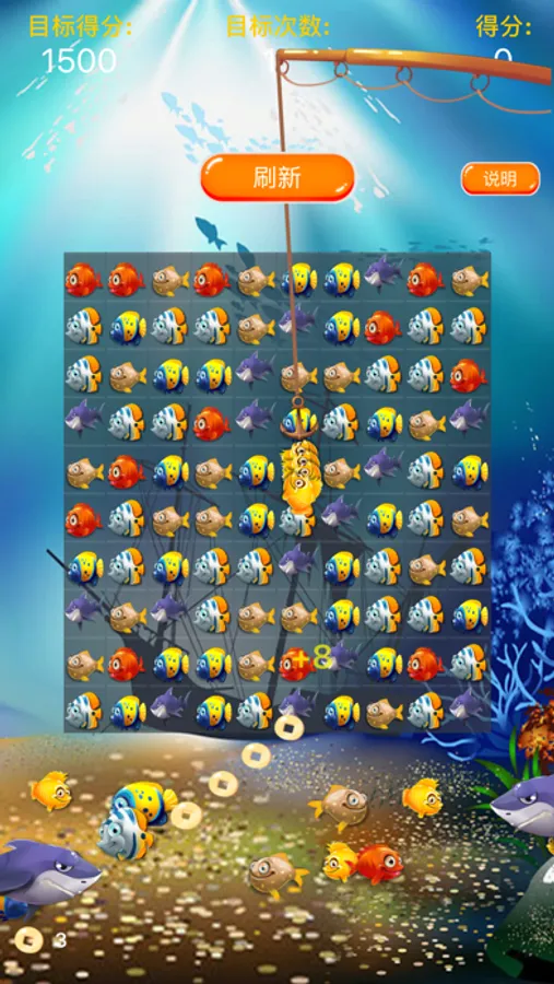 1. 拖动行或列上相邻的小鱼,排列成三个相同的即可消除