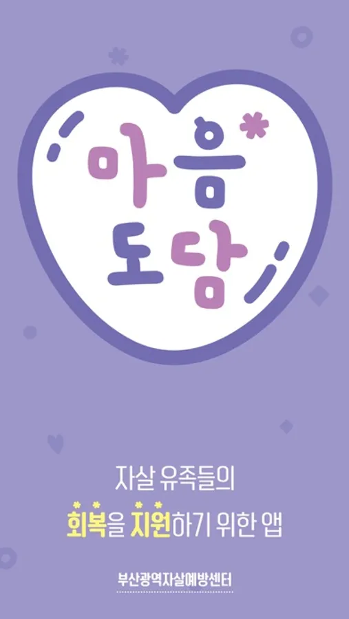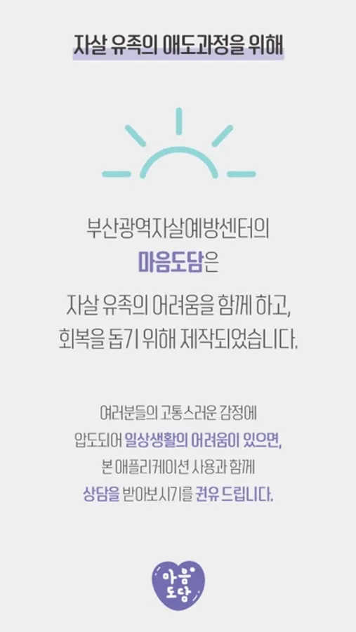 부산광역자살예방센터에서는 마음도담 어플리케이션을 통해 자살 유족의 아픔을 극복하고 새로운 희망을 찾을 수 있기를 바랍니다.