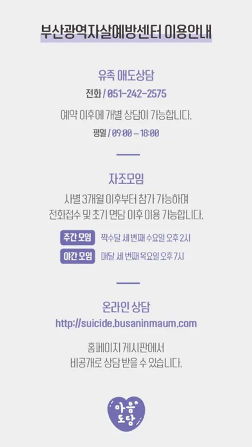 - 온라인 상담: 홈페이지http://suicide.busaninmaum.com) 게시판에서 비공개로 상담 받을 수 있습니다.