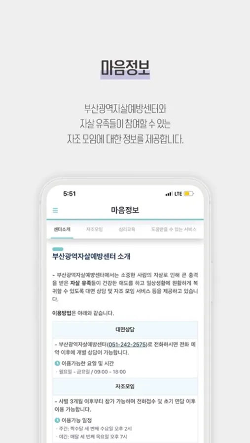 - 대면상담: 전화(051-242-2575) 예약 이후에 개별 상담이 가능합니다.
