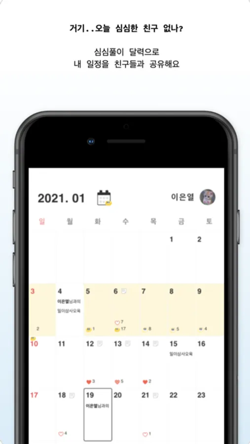 요즘 뭐해? 심심풀이 달력을 통해 내 일정을 친구들과 공유해요, 내 히스트리를 만들고 공유 할 수 있어요