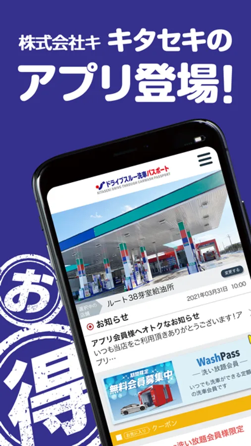 愛車のトータルサポートなら株式会社キタセキのアプリ「キタセキドライブスルー洗車パスポート」にお任せ下さい!