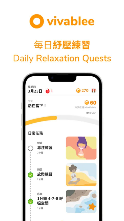 Vivablee offers a vast library of guided meditation content in Cantonese catered for different moments of a given day, as well as personalized soundtracks configured to your liking. Vivablee is your very own mindfulness companion!