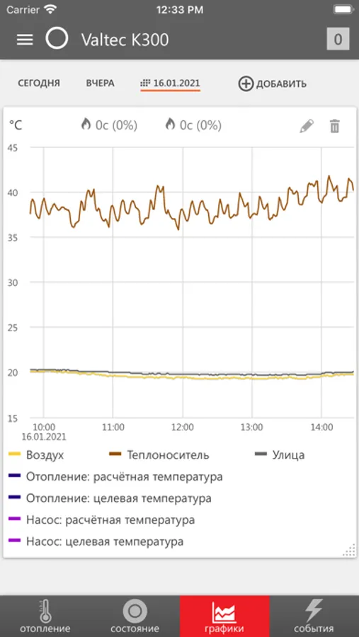 • запись и хранение значений параметров системы отопления, ведение журнала событий (статистика), отображение графиков работы;