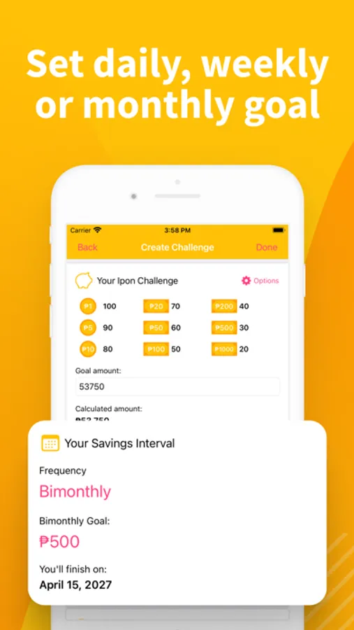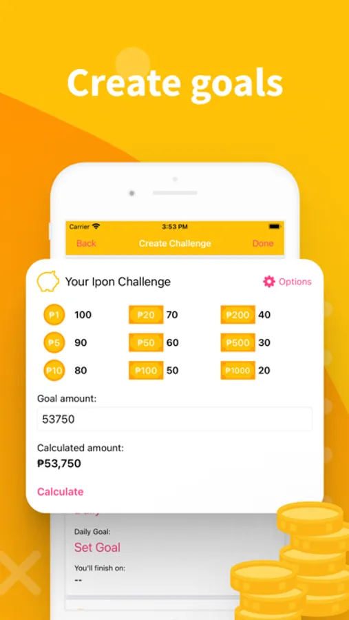After the app finds the best challenge for you, you could then customize the challenge to your liking. Create a 50 pesos challenge or the famous peso sense ipon challenge! Customize your goal amount, edit the ipon challenge calculation, and more.