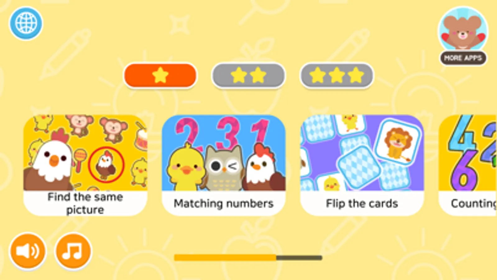 Each game is divided into 3 difficulty levels. Please guide your parents wisely so that children can repeat the difficulty or challenge the difficulty.