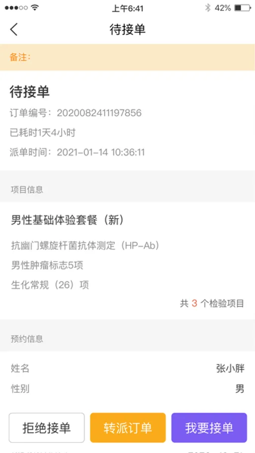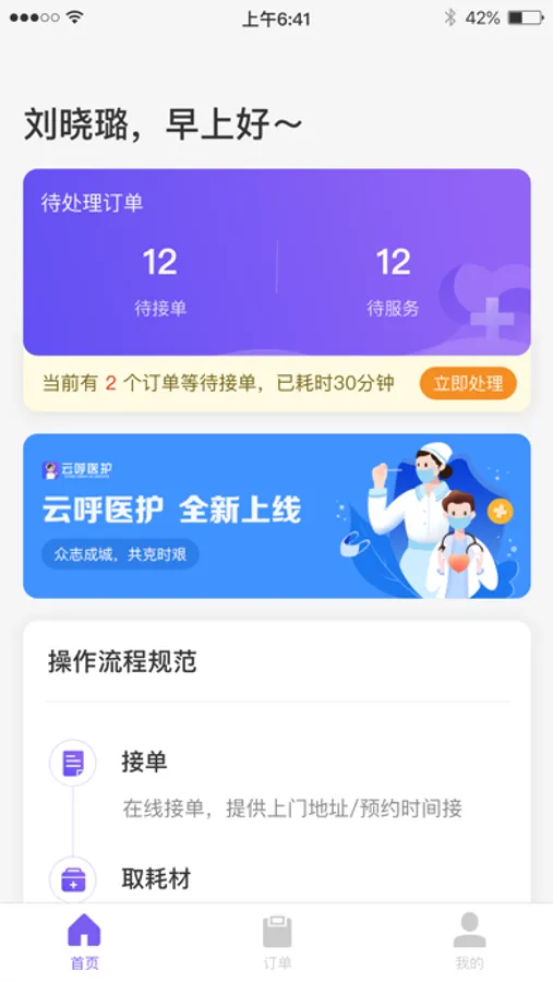 医护人员在线接单,完成上门采样、条码录入、订单核销、标本送达服务。
