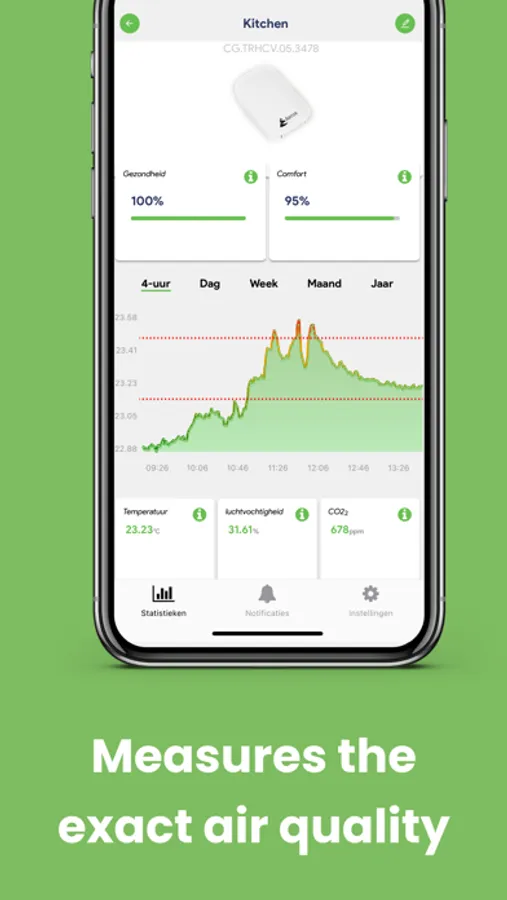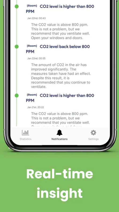 The Aeros analyzes and helps you improve your indoor climate. The user-friendly app, which is activated with a QR code, gives you an overview of the current air quality. You can also discover trends, view historical data, monitor equipment, and predict maintenance. You will automatically receive a notification when recommended limit values are reached. You will also receive important push notifications if you have set this up.