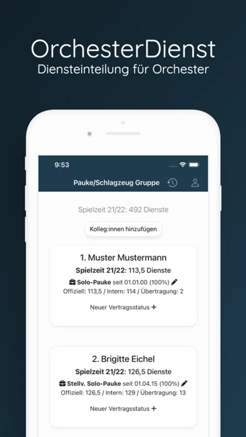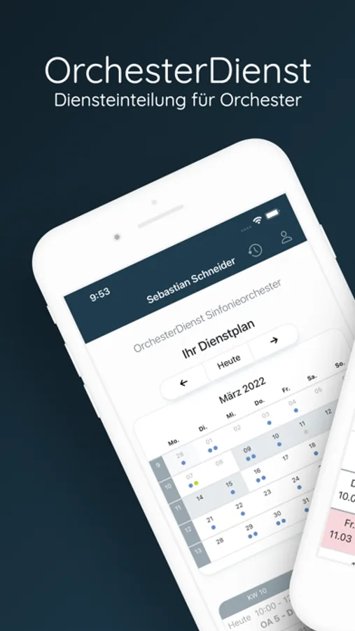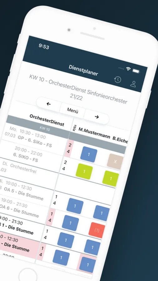 Sicherlich ist das Management der Dienste innerhalb eines Orchester eine komplizierte Angelegenheit. Aus diesem Grund haben wir eine innovative Anwendung entwickelt, die sowohl Dienstplanung als auch Organisation vereinfacht und beschleunigt. Mit unserer App können Sie Ihren Dienstplan jederzeit und überall überprüfen bzw. bearbeiten.
