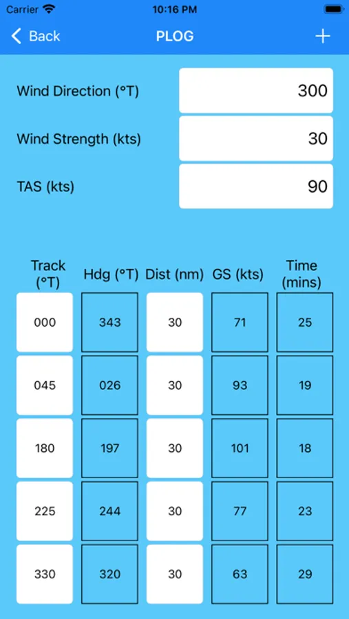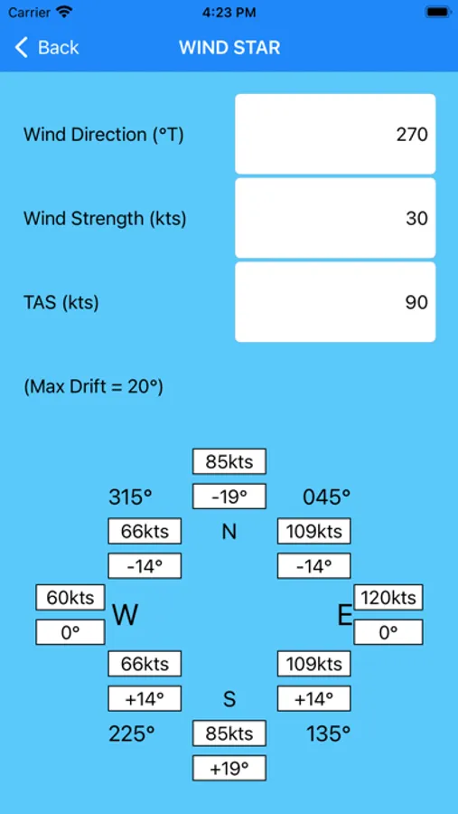 - User enters the wind and TAS and drift and groundspeed are calculated for the 8 compass points